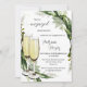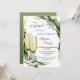 Invitación a una fiesta de compromiso con una escena de vegetación acuática con copas de champán y textos de escritura elegantes.
