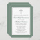 Elegante Sage Green y Plata Primera Invitación de la Santa Comunión con Cruz. Marco plateado. Cruz de Plata. Estilo de tickets.