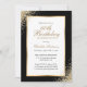 Elegante invitación de cumpleaños en negro y oro con detalles de cumpleaños dentro de un marco negro y dorado adornado con confeti de oro. Personalice fácilmente esta plantilla a cualquier fiesta de cumpleaños.