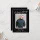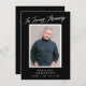 Esta elegante tarjeta de fotos conmemorativa *y* invitación a la celebración de la vida incluye un fondo negro, una sola foto vertical y una tipografía simple y elegante en blanco. Una por la parte trasera, el fondo negro se repite con texto para una invitación a una celebración de la vida. Si lo desea, puede eliminar el texto de la parte posterior, sólo tiene que hacer clic en "editar con herramienta de diseño".