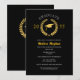 Una invitación refinada y elegante para una fiesta de graduación que presenta un fondo negro clásico, incluye un icono de corona de laurel dorada y gorra de graduación y tipografía elegante. Esta tarjeta emana sofisticación y es perfecta para una celebración formal. Personalice con su propio texto y dirección del evento de la fiesta y celebre su fiesta de graduación.