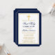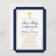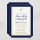 Elegante invitación a la comunidad azul de la marina y oro por primera vez sagrada con cruz. Marco dorado. Cruz de Oro.