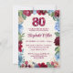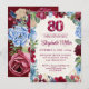 Elegante cumpleaños 80 - Invitación de diseño floral de Borgoña. Celebra 80 maravillosos años con esta elegante invitación de cumpleaños floral. Con ricas flores de color rojo burdeos y azul en un suave fondo texturado, este diseño destaca el hito con una audaz floral "80" y una tipografía clásica. Una manera elegante de invitar a los huéspedes a una memorable celebración de cumpleaños número 80. ¡Disfruta!