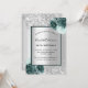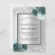 Fondo de color plateado falso decorado con flores verdes, flores y purpurinas falsos de plata, chispas. Personalice y agregue su nombre y detalles del fiesta. Cartas negras.