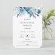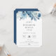 Invitación para cena de ensayo. La tarjeta presenta un ramo elegante de flores azules polvorientas y azules marinas. Diseño de tipografía moderno y chic, con respaldo de color azul marino apagado coincidente.