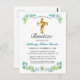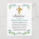 Celebre el bautismo de su hijo amigos y familiares invitándolos con esta elegante postal de invitación de bautismo floral de oro y verde azulado. Este diseño presenta una hermosa cruz de oro con un marco floral sobre un fondo blanco simple. Personaliza el texto y la fuente a tu gusto. Otras fuentes y estilos. Contáctanos con tus especiales y estaremos encantados de ayuda.
