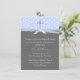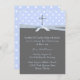 Invitación del bautizo del bebé elegante hecha en gris, con un jefe azul claro y blanco del lunar, y gráficos de una cinta doble azul claro como frontera. Los gráficos de una cruz gris, adornan el área superior del jefe del lunar. El texto azul claro está listo para personalizar para leer lo que usted quiere. Invitación preciosa.