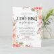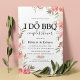 Invitaciones elegantes para una fiesta de compromiso con barbacoa con un fondo blanco chic y clásico que se puede cambiar a cualquier color, una exhibición floral en acuarela rosa en la esquina y una plantilla de celebración de "te amo barbacoa" que es fácil de personalizar.