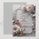 Este elegante diseño de invitación para baby shower de novia presenta una lujosa disposición floral en 3D en tonos suaves de rosa, marfil y plata metálica. Las intrincadas rosas y delicadas flores de papel están bellamente detalladas, creando un aspecto sofisticado y atemporal. Un refinado marco ornamentado con acentos metálicos añade un toque clásico, mientras que el sutil fondo realza la elegancia general. La composición equilibrada de elementos florales y florituras decorativas hace que este diseño sea perfecto para una celebración moderna y romántica.