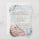 Hermosa invitación de despedida de soltera con champán rosado, azul teal y rosa, zapato de tacón alto con perlas marfil. Esta elegante invitación de despedida de soltera vintage se personaliza fácilmente para su evento con la elección de redacción, estilo de fuente, etc.