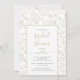 Elegante invitación a la ducha de oro y de novia blanca con dibujos en línea de conchas, tortugas marinas y caballos de mar. Tipografía de guiones. Vea la coordinación de artículos en nuestra tienda, Enchanted Finch.