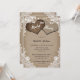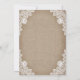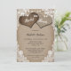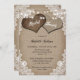 Rústica invitación a una ducha de novias campestres con dos corazones burlap en un vintage fondo burlap adornado con encaje floral blanco y luces de cuerdas.