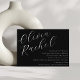 Esta invitación al murciélago contemporáneo mitzvah presenta una composición horizontal minimalista y una hermosa caligrafía de escritura en blanco sobre un fondo negro.