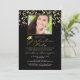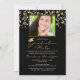Elegante invitación a una fiesta de graduación en blanco, negro y dorado que incluye la foto de tu graduado, confeti, gafas y luces, un diseño de tipografía de escritura a mano a la moda, acentuado con un gorro de graduación o un mortero en oro contra un fondo negro editable que puedes cambiar a un color escolar, un color para coordinar con tu foto o un color favorito. La parte posterior presenta CLASE DE AÑO. ASISTENCIA: Para obtener ayuda con la modificación o personalización del diseño, el cambio de color, la transferencia del diseño a otro producto o desea coordinar elementos, póngase en contacto con el diseñador ANTES DE PEDIDOS a través de la pestaña MENSAJE de chat de Zazzle o envíe un correo electrónico a makeitaboutyoustore@gmail.com.