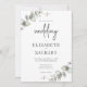 En esta moderna invitación a la boda botánica, el texto se compone de dos brotes de acuarela de eucalipto verde. La palabra "boda" aparece en la escritura gris de carbón vegetal. Personalice la invitación con los nombres de la novia y el novio en la tipografía del suero y los detalles del boda en cursiva.