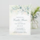 Elegantes parejas duchan una invitación con hojas de eucalipto y vegetación con un toque de azul y especkles de falso purpurina de oro en la parte superior. Debajo están los detalles de tu evento en verde oscuro, sobre un lavado de acuarela pastel. El reverso es una sombra de verde azul suave. Este sencillo diseño rústico es ideal para una celebración botánica en verano.