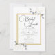 El eucalipto y las hojas de mirto, dibujados a mano con un lápiz de grafito clásico y recubierto de capas, algunas de oro (digitalmente), crean un modelo moderno, sofisticado, elegante y de moda para la ducha de novias que tiene una visión moderna de un marco tradicional de boda floral. La textura del lápiz negro se muestra en el papel blanco, dándole una sensación de elegancia sin esfuerzo. El marco es también una versión actualizada de un clásico, que da una estructura de diseño pero que mantiene un sentido de frescura moderna. Presenta un guión moderno de caligrafía para el título, "Bridal Lunch". Un diseño atemporal para una boda de invierno, primavera, verano o otoño, pero también una buena elección para una ducha de novias de invierno o otoño, con su gris neutro y oro.