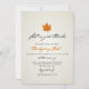 Invite a su familia y amigos a su Fiesta de Acción de Gracias con estilo con esta elegante invitación de Acción de Gracias que incluye un solo ilustracion naranja de hojas de otoño. Tiene la opción de mover los elementos de diseño y cambiar la redacción/fuente/color para que se ajuste también a su estilo.