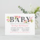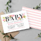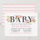 Esta moderna invitación horizontal para fiesta de bebé muestra el título en negrita "Bebé" coronado con exuberantes flores de acuarela en rosa pálido, durazno y dahlia y rosas con follaje verde primaveral. La caligrafía en rosa destaca el nombre de la homenajeada para un look suave y femenino. El respaldo a rayas rosas y blancas añade un detalle coordinado y divertido. Todo el texto es totalmente editable para personalizar tu celebración.