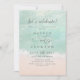 La romántica invitación a la fiesta de compromiso con la temática costera tiene hermosas acuarelas abstractas y turquesas que brillan por la ola oceánica y el fondo de la playa, con un guión elegante y elegantes detalles de los eventos de tipo font, moderno y sencillo, ideal para bodas en la playa de arena, bodas con destino tropical, boda con temática oceánica costera. Vea todas las piezas coincidentes de la colección.