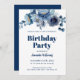 Elegante invitación de fiesta de cumpleaños azul de la Marina Floral Elegante plantilla para una invitación de cumpleaños femenina en un tema botánico en azul marino y crema.