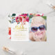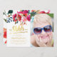 Elegantes invitaciones sorpresa para fiestas de cumpleaños con un fondo blanco clásico, una foto del chico o chica de cumpleaños, una exhibición floral de color bonito, un elegante título tipográfico de imitación de Relieve metalizado de oro y un moderno patrón de celebración de cumpleaños.
