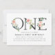 Elegantes invitaciones de primer cumpleaños con letras grises de carbón, flores de color azul y toques verdes de follaje. Personalice las invitaciones florales de la fiesta de primer cumpleaños agregando los detalles de su fiesta. El reverso de las invitaciones tiene un fondo color de agua rosa.