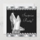 Elegantes zapatos de tacón alto purpurina y diamantes mujeres invitan a la fiesta de cumpleaños sorpresa. Esta hermosa invitación sorpresa para sorpresas en blanco y negro se personaliza fácilmente para el evento añadiendo los detalles del evento, el estilo de fuente, el tamaño y color del tipo de letra y la redacción.