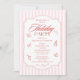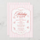 Elegante Navidades corporativos Invitaciones a fiestas de vacaciones de la compañía presentan elementos sencillos y caprichosos de Navidades rojos sobre un fondo rayado rosa y blanco con el texto "Fiesta de vacaciones" en elegante tipografía de escritura de caligrafía roja. Elegante, moderno y moda para su fiesta de vacaciones corporativa. Creado por Evco Studio www.zazzle.com/store/evcostudio