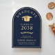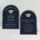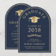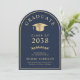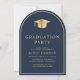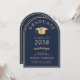 Elegante invitación de graduación universitaria azul en forma de arco e invitación a fiesta con una gorra de oro y una tipografía clásica de sérico dorado para el nombre del graduado, año de clase, universidad o universidad, grado y especialidad o honores. En la parte posterior, añada los detalles de su fiesta.