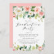 Elegantes invitaciones para fiestas de graduación floral con un borde superior e inferior de flores acuarelas pintadas y follaje de rosa rosa, blanco y verde vibrante. Las palabras "Parte de Graduación" se muestran en una letra de guión elegante con los detalles de su fiesta que se muestran a continuación. La invitación se invierte a un fondo rosa rubor sólido.