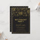 Invitación elegante de fiesta de jubilación floral con estampado floral y borde de lámina de oro falso sobre un fondo gris oscuro en la parte delantera. La invitación tiene un patrón de lunares de oro falso sobre un fondo gris oscuro en la parte trasera.