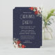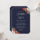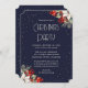 Elegante invitación de fiesta de Navidades azules perfecta para Navidades fiestas, vacaciones, eventos corporativos, fiestas de cócteles de vacaciones y más. Personaliza fácilmente esta atractiva invitación a la fiesta con botánicos de invierno de poinsettia blanca, con bayas rojas, ramas de coníferas y pequeñas estrellas con tus detalles fiestas.