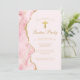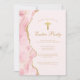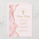 El ágate rosa y dorado de la moda decora el lado de esta hermosa invitación a la fiesta de Pascua. Una elegante invitación para un brunch de Pascua con los chicas o la caza de huevos de los niños. Encantadora cruz cristiana por encima de tus detalles fiestas en escritura oro bonito.