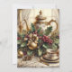 Esta elegante invitación incluye un servicio de té vintage con acentos dorados y verdes de las vacaciones. Use esta plantilla para sus necesidades especiales de fiesta de té o té. Obra de arte generada por IA con dirección de diseño de Susang6.