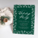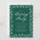 Sencilla y elegante invitación para fiestas vacacionales con un borde de copos de nieve blancos y ramas de pino sobre un fondo verde. "Fiesta de vacaciones" se muestra en un guión de caligrafía en negrita blanca con los detalles de su fiesta que se muestran a continuación. La fiesta de las copas de nieve invita a los inversos a mostrar un hermoso patrón de copos de nieve.