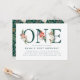 Elegantes y elegantes invitaciones para el primer cumpleaños con letras de color verde oscuro con poinsettias de color rojo, rosas de marfil, bayas y toques folclóricos verdes. Personalice las invitaciones para fiestas de 1er cumpleaños con temática navideña/invernal añadiendo los detalles de su fiesta. En el reverso de las invitaciones se observa una acuarela floral de invierno con un fondo verde oscuro.