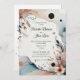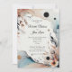 La invitación presenta un diseño elegante con un fondo de color crema mezclado con colores suaves y ilustraciones artísticos de flores y hojas. Los nombres de la pareja boda están escritos en una elegante tipografía de escritura. Debajo de los nombres, hay información sobre el evento boda escrito en un tipo de letra más pequeño pero aún elegante. Los diseños florales y de hojas que rodean el texto añaden elegancia general a la invitación.