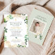 Esta elegante ceremonia de bautismo y la invitación a la celebración del almuerzo para una niña incluye una elegante redacción personalizado para su evento especial acentuado por una cruz de oro y enmarcado por una bella corona floral de flores neutras blancas, rosa rubor y rosa color crema con vegetación verde y dorada. En la parte posterior de la tarjeta aparece un fondo verde suave con espacio para fotos de recién nacidos. Personalice el texto "Dios bendiga" con el nombre del bebé en escritura.