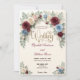 Anuncie su ceremonia de jardín romántico con esta sofisticada suite botánica, que presenta una paleta refinada de azul polvoriento, rosa y rosas burdeos. Este diseño presenta un fondo suave crema enmarcado por un borde arqueado de rosas azul polvoriento, rojo burdeos y rosa mezcladas con follaje de eucalipto verde salvia. La composición utiliza una jerarquía tipográfica formal, combinando una elegante letra caligráfica para los nombres con una fuente clásica serif para los detalles del evento. Un elemento tecnológico cuadrado escaneable se incorpora perfectamente al diseño tradicional sin interrumpir el flujo visual. Esta es una imagen impresa plana con un efecto de pintura de acuarela impresa, no material realzado ni textura pintada a mano.