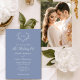 Nuestra elegante invitación a la boda azul incluye una florida corona botánica que rodea las iniciales del monograma de la novia y el novio. Esta elegante invitación a la boda puede ser personalizada con su información en un hermoso guión de caligrafía blanca sobre un fondo azul. La parte posterior de la tarjeta muestra su foto de compromiso favorita.