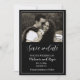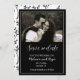 Esta elegante foto de guión guardar la tarjeta de fecha es perfecta para los que prefieran el aspecto minimalista. El diseño de la tarjeta incluye tu foto favorita o foto de compromiso formal contra un fondo negro. Las palabras Save the Date (Salvar la fecha) y los nombres de novios y novios se hacen en una hermosa y romántica tipografía de escritura blanca. El resto se hace en una sencilla letra blanca para seguir la temática minimalista. Actualice la tarjeta con su información utilizando la plantilla fácil que se proporciona. El lado inverso de la tarjeta tiene un elegante patrón de hojas en blanco y negro.