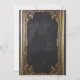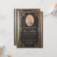 Esta elegante invitación de funeral con aire vintage tiene un marco dorado antiguo con decoraciones doradas elegantes sobre un fondo negro. Hay una foto de marcador de posición en un marco ovalado en la parte superior, con texto arqueado encima. El nombre está escrito en una elegante letra caligráfica. Todo el texto se puede personalizar y tiene un color dorado similar a las decoraciones doradas del marco.