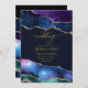 Esta fascinante invitación a la boda presenta un diseño de ágate inspirado en la galaxia en tonos azules y violetas, acentuado con detalles de oro brillantes y tipografía elegante. El reverso incluye un código QR que permite a los clientes acceder a información adicional sobre bodas sin esfuerzo. Perfecto para los bodas modernos y de temática celeste.