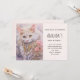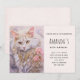 Invitación a una fiesta de cumpleaños con una encantadora ilustración. Un gato blanco de pelo largo que parece regio y elegante. Rodeado de flores rosas y diamantes.
