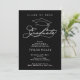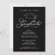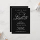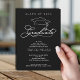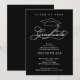 Un gorro de graduación y la palabra "graduado" en un elegante guión blanco PLUS el nombre y año de tu graduación y tu información sobre estas invitaciones para una fiesta de graduación negra. CONSULTE TODA LA COLECCIÓN de colores prehechos, placas de papel, servilletas, tapones de grad y más en nuestra tienda.