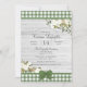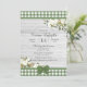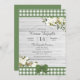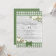Elegante diseño floral verde y de gingham sobre un fondo de madera blanca para un fiesta de estilo rústico, rústico o chic. Personalizar esta invitación a la ducha de bebé con sus propios nombres, dirección, fecha y registro.