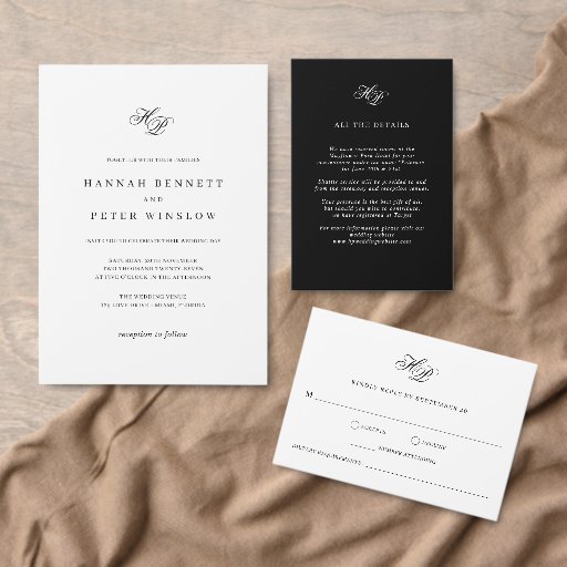 Esta intemporal invitación a la boda en blanco y negro exuda elegancia y sofisticación. En su parte central, un hermoso monograma muestra las iniciales de la pareja en una fuente blanca de escritura flamenca. La paleta monocromática realza el encanto minimalista de la invitación, permitiendo que los detalles intrincados del guión ocupen el centro del escenario, lo que evoca una sensación de lujo subestimado. Perfecto para parejas que valoran la sofisticación moderna con un toque de romanticismo clásico, esta invitación marca el tono para una celebración inolvidable.
