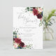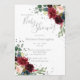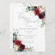Elegante fondo blanco con flores borgoñas y rubias. Esto es una invitación para un niño o chica a la ducha de bebé. Sopa de purpurina plateado. Guión gris y tipografía. Tan bello