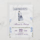 Una hermosa invitación de boda islámica con suaves acentos florales azules y una linda novia y novio de dibujos animados. Perfecta para Nikah o bodas musulmanas tradicionales. Totalmente personalizable con sus nombres y fecha.